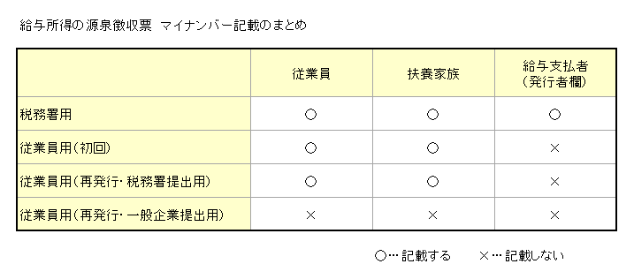 2015年(平成27年)10月2日 国税庁の発表により、従業員本人に渡す「給与所得の源泉徴収票」には、マイナンバーを記載しないこととなりました。そのため、税務署用を除き、従業員のマイナンバーおよび扶養家族のマイナンバーは記載されないものと想定されます。
