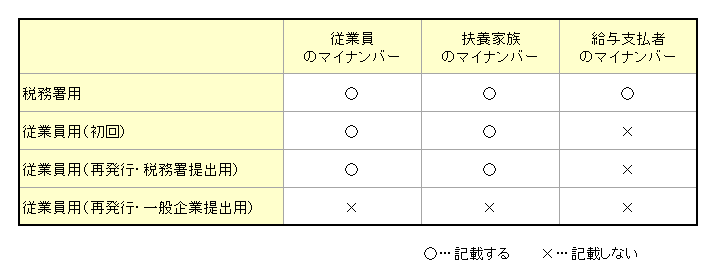 「給与所得の源泉徴収票」は、税務署用はマイナンバーを記載、従業員用は給与支払者のマイナンバーを記載しなくていいなど、細かなルールがあります。